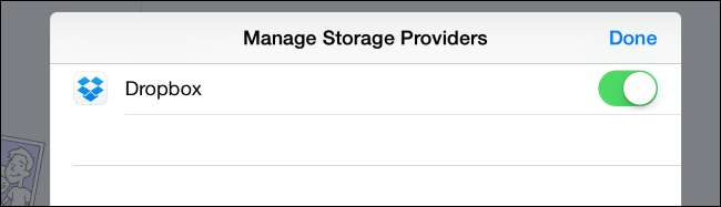 Du ser en lista med tillägg för lagringsleverantörer du har installerat - till exempel tillhandahåller Dropbox för närvarande en om du har Dropbox-appen installerad. Aktivera alla du vill använda.
