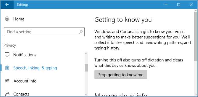 Du kan ändra den här inställningen om du vill. Gå till Inställningar> Sekretess> Tal, färg och skrivning. Klicka på "Sluta lära känna mig" för att hindra Microsoft från att samla in dessa uppgifter.