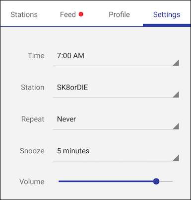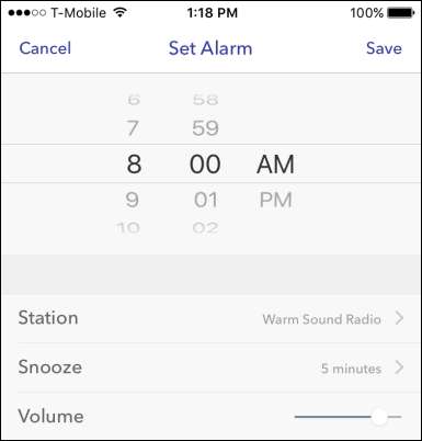 Här i iOS-versionen måste du ställa in tid, station och volym som du vill väcka. Dessutom kan du ställa in snooze-tiden, som standard är fem minuter.