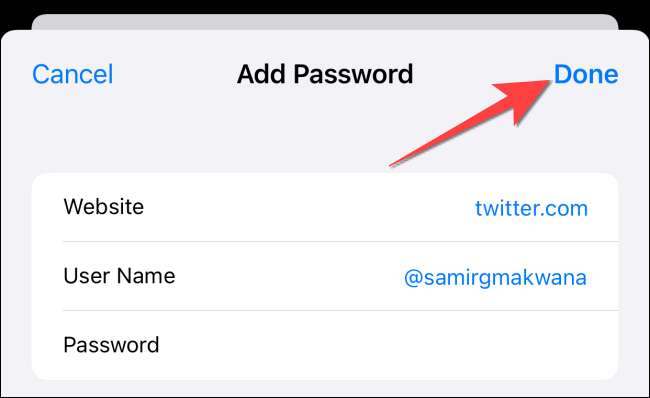 Skriv webbplatsadressen, användarnamnet och det befintliga lösenordet. Du hittar också ett starkare lösenord som föreslås ovanpå tangentbordet om du vill uppdatera inloggningen med ett starkare lösenord. Slutligen, tryck på "Klar" för att fortsätta.
