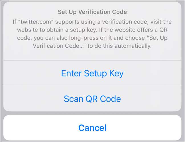 Nästa skärm visar dig en QR-kod. Använd din iPhones kamera-app för att skanna den QR-koden från Twitter-webbplatsen. Tryck sedan på "Lägg till verifieringskoden i lösenord" -meddelande som visas längst upp på skärmen.