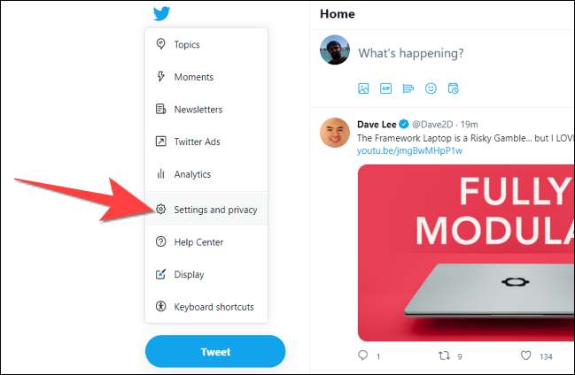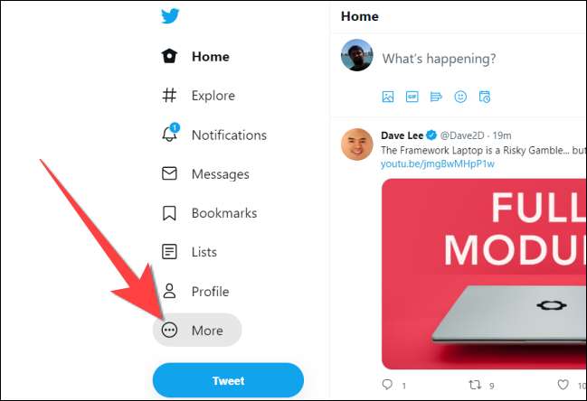 För att komma åt det, först öppna Twitter webbplats I en webbläsare på din dator och tryck på knappen "mer" på vänster sida.