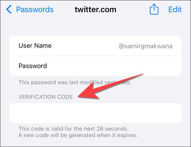 Verifiera din identitet med ansikts-ID eller tryck på ID och välj kontot för att lägga till verifieringskoden. När du har lagt till det för Twitter-webbplatsen i "Lösenord" ser du avsnittet "Verifieringskod" som ger en sexsiffrig kod som ändras var 30: e sekund.