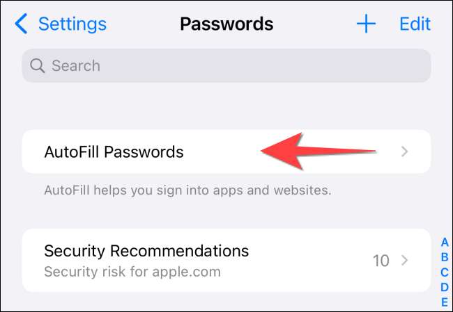 Öppna "Inställningar" -appen och tryck på "Lösenord" på din iPhone eller iPad och använd ansikts-ID eller tryck ID för att komma till avsnittet "Lösenord". Tryck sedan på "AutoFill Passwords."