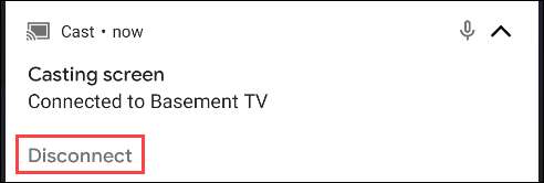 För att sluta kasta din skärm, svepa ner från toppen av skärmen och tryck på "Koppla bort" på den gjutna anmälan.