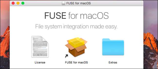 Först ladda ner FUSE för macOS och installera den. Använd standardalternativen när du installerar den.