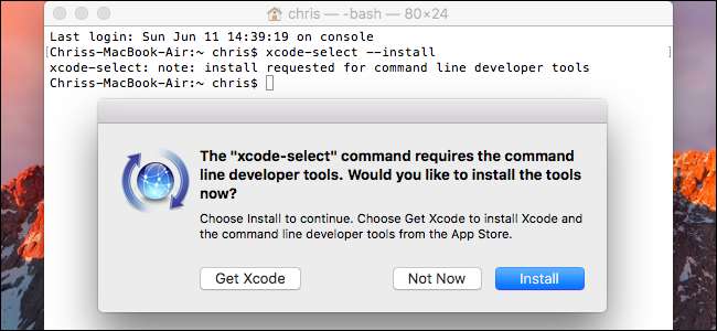 Du behöver också installera Apples kommandoradsutvecklarverktyg för att fortsätta. Om du inte har installerat dem ännu kan du öppna ett terminalfönster från Finder> Program> Verktyg och köra följande kommando för att göra det: