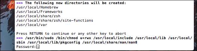 Tryck på Enter och ange ditt lösenord när du blir ombedd. Skriptet hämtas och installeras automatiskt Homebrew.
