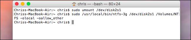 Från Mac-skrivbordet öppnar du ett terminalfönster igen och kör följande kommandon för att göra ntfs-3g-funktionen: