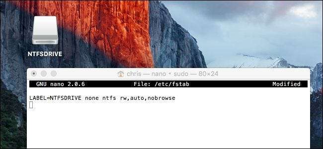Lägg till följande rad i nano och ersätt "NAME" med etiketten på din NTFS-enhet: