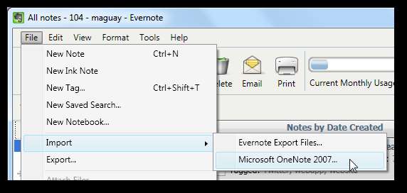 Det är ganska enkelt att importera dina OneNote 2007-anteckningar till Evernote. Öppna Evernote, klicka Importera i filmenyn och välj Microsoft Onenote 2007 .