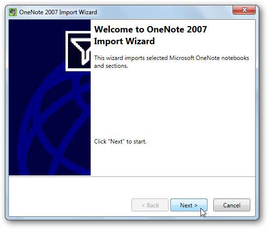 Om OneNote 2007 är installerat bör du se ett fönster enligt nedan. Klick Nästa för att starta.