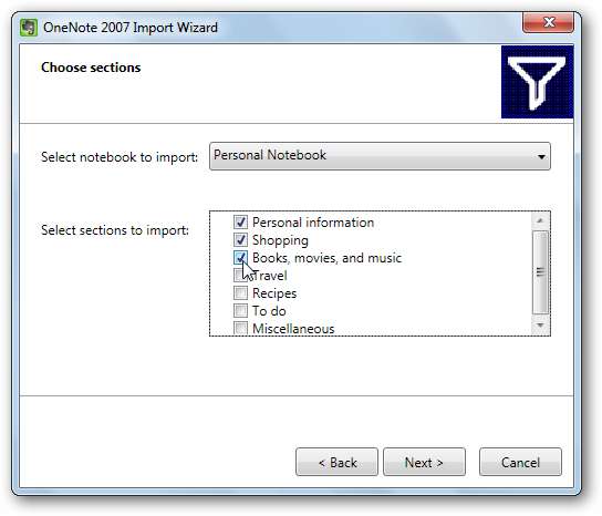 Importguiden visar en lista över tillgängliga OneNote-anteckningsböcker från toppmenyn. Välj den anteckningsbok som du vill importera och välj sedan avsnitten från anteckningsboken du vill importera nedan. Tyvärr finns det inte ett alternativ att importera alla dina bärbara datorer samtidigt. du måste välja anteckningsböcker och sektioner individuellt. När du har gjort dina val klickar du på Nästa .