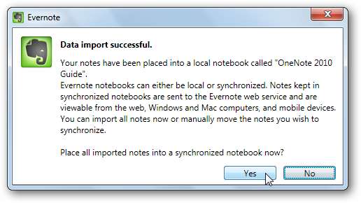 När den är klar ser du en bekräftelse som informerar dig om att data har importerats. Observera att importerade anteckningsböcker som standard bara sparas på din lokala dator. Om du vill att dina importerade OneNote-anteckningsböcker ska synkroniseras med Evernote Web och andra datorer eller enheter som du äger, klicka på Ja för att konvertera anteckningsboken till en synkroniserad anteckningsbok. Du kommer sannolikt att vilja göra detta, eftersom synkronisering är en av Evernotes bästa funktioner.