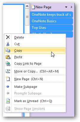 Det kan ta att kopiera och klistra in dina data från varje anteckning evigt om du har massor av anteckningar kan du istället kopiera ett helt avsnitt åt gången. För att göra detta, välj alla dina sidor på höger sida, högerklicka och välj Kopiera . Du kan välja alla sidor genom att välja den första sidan, sedan hålla ned shift-tangenten och välja den sista.