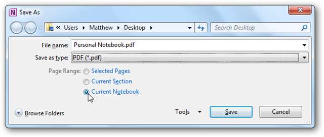 Välj PDF i tillgängliga filtyper och se till att du väljer Nuvarande anteckningsbok i sidintervallet.