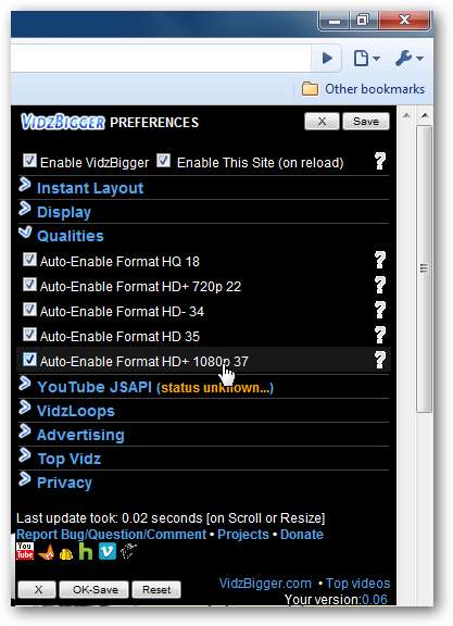 Det finns flera sätt som du kan justera VidzBigger för att styra utseendet på filmerna. Tillgång till alternativen finns i det övre högra hörnet på webbsidan när du tittar på en video.