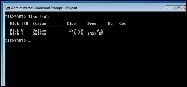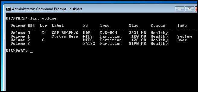 Slutligen måste vi ge vår USB en enhetsbokstav så att vi kan kopiera installationsfilerna till den. För att göra det måste vi få en lista över volymer på vår maskin: