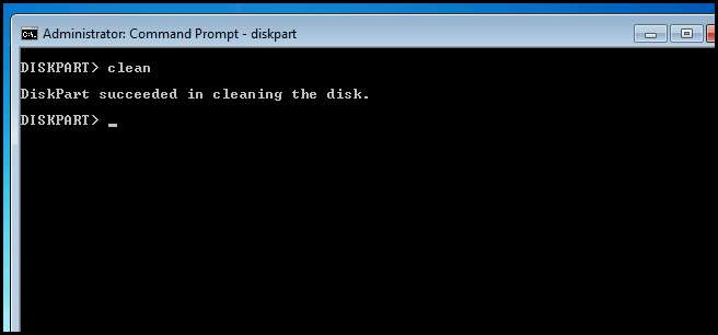 Nu måste vi torka alla befintliga partitioner från enheten, du kan göra det med hjälp av kommandot clean: