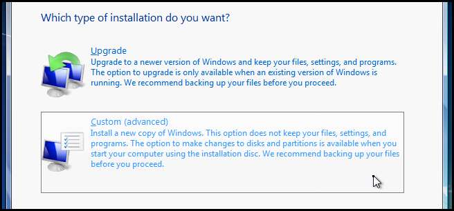 För att göra en ren installation, välj en anpassad (avancerad) installation.