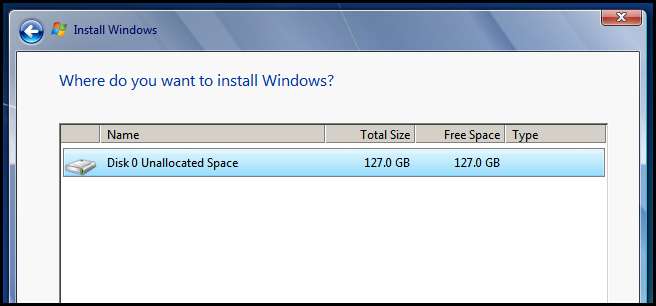 Du bör bara ha en hårddisk som inte bör innehålla några partitioner just nu, så fortsätt och klicka för att starta installationen.