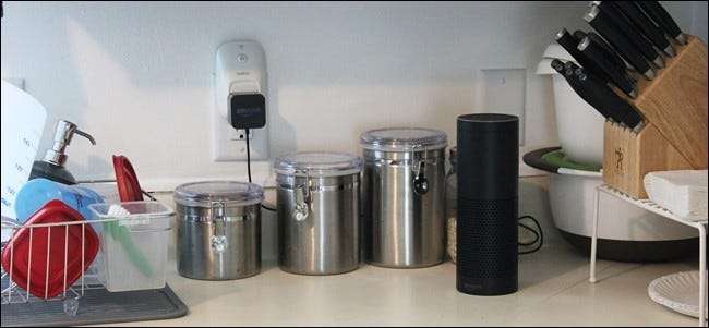 Anslut bara uttagsomkopplaren och anslut sedan ditt Amazon Echo till strömbrytaren. När strömbrytaren stängs av stängs ditt Echo av, eftersom Echo helt enkelt slås på när det är inkopplat - det finns ingen strömbrytare.