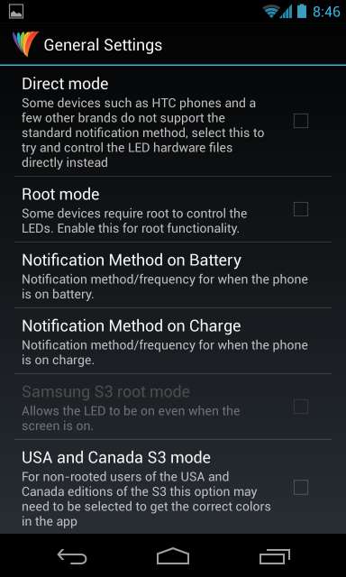 Inställningsskärmen innehåller en mängd andra justeringar som kan hjälpa Light Flow att arbeta på en mängd olika enheter, ett "viloläge" som inaktiverar meddelandedioden under vissa timmar för att spara ström och många andra inställningar. Det finns också en skärm för fler appar där du kan tilldela anpassade aviseringsfärger för hundratals appar från tredje part, även om den här funktionen endast är tillgänglig i den betalda versionen.