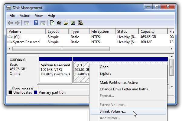 På skärmen Diskhantering högerklickar du bara på den partition som du vill krympa och väljer "Krympvolym" från menyn.