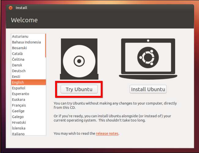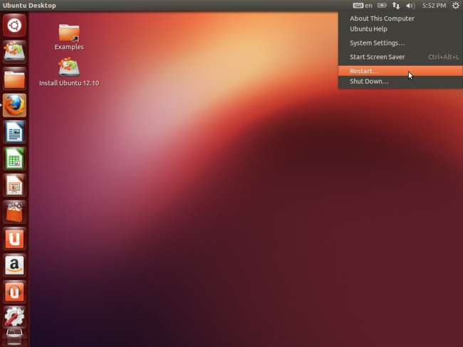 För att starta ditt nya, bärbara Linux-system på vilken dator som helst, anslut USB-enheten eller sätt i skivan och använd alternativet Starta om i Windows för att starta om datorn. Datorn ska starta från USB-enheten eller skivan och ta dig till ett Linux-skrivbord. Du kan se en installationsdialog - klicka på alternativet Prova Ubuntu om du gör det.