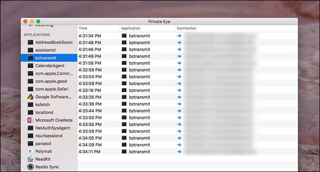 Starta Private Eye så kommer det omedelbart att övervaka din nätverkstrafik. Varje gång en ansökan gör en begäran ser du programmets namn och vilka adresser de har anslutit till. Resultaten läggs till i realtid.