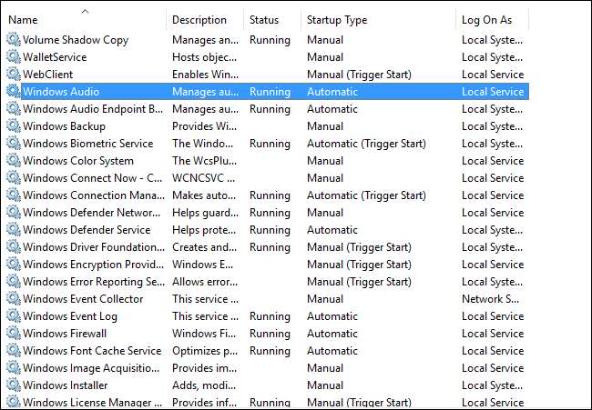 Bläddra igenom listan så ser du detta i aktion. Till exempel är Windows Audio-tjänsten inställd på Automatisk så att din dator kan spela ljud. Windows Security Center-tjänsten startar automatiskt så att den kan hålla reda på säkerhetsproblem i bakgrunden och varna dig, men den är inställd på Automatisk (Fördröjd) eftersom den kan vänta några minuter efter att din dator startar för att börja göra det. Sensorövervakningstjänsten är inställd på Manuell (Trigger Start) eftersom den bara behöver startas om din dator har sensorer som behöver övervakas. Faxtjänsten är inställd på Manuell eftersom du förmodligen inte behöver den, så den körs inte i bakgrunden. Känsliga tjänster som den genomsnittliga datoranvändaren inte behöver, som Remote Registry, är som standard inaktiverade. Nätverksadministratörer kan aktivera sådana tjänster manuellt om de behöver dem.