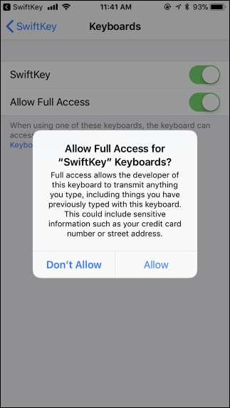 När du har aktiverat "Full åtkomst" för ett tangentbord på iOS är alla spel avstängda och du är lika utsatt som för Android. Det finns några undantag - till exempel tillåter iOS inte att tangentbord från tredje part fungerar i lösenordsfält för operativsystem. Men du skulle till stor del vara i lika mycket problem som om du hade installerat samma tangentbord på en Android-telefon. Därför varnar Apple dig så starkt när du försöker ge ett tangentbord full åtkomst.