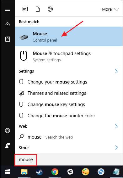 Klicka på Start, skriv "mus" och klicka sedan på markeringen för att öppna musens kontrollpanel-app.