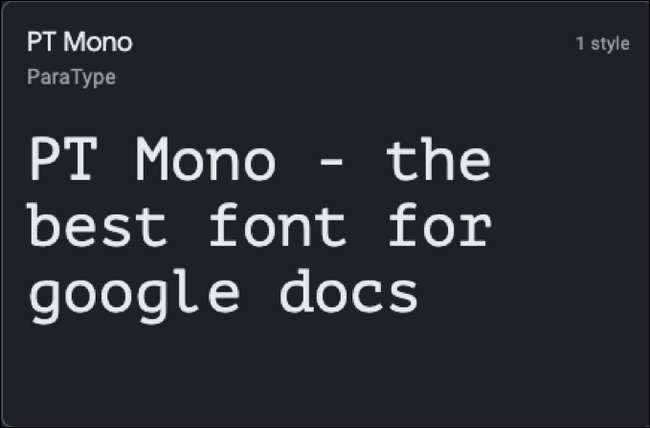 Om du är en tung användare av kalkylblad, ska det här teckensnittet vara din go-to. Varje tecken har samma mängd bredd, så det är lättare att beräkna storleken på inträdesfält, celler eller tabeller. För att aktivera PT Mono på dina Google Docs måste du gå till listan Font Alternativ och välj "Fler teckensnitt."
