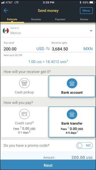 Den här är lite annorlunda och konkurrerar inte direkt med de andra apparna vi har pratat om. Du skickar inte pengar digitalt till människor som de kan spendera eller flytta till deras bankkonto. Du kan skicka pengar till någons bankkonto, men du behöver deras fullständiga bankkontouppgifter för att göra det. Istället är det verkliga värdet av den här appen att den erbjuder en modern variant av Western Union: s gamla tjänst: att få faktiska pengar till människor.