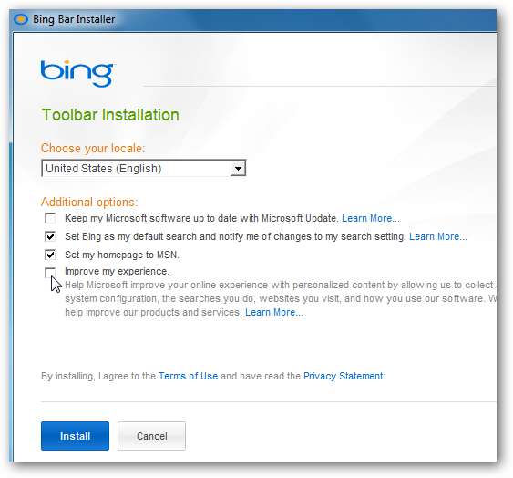 När du startar installationen finns det några ytterligare alternativ som du kanske inte vill installera. Om du till exempel inte tror att Microsoft behöver veta din systeminformation eller vad du söker efter, avmarkera Förbättra min upplevelse .