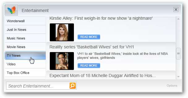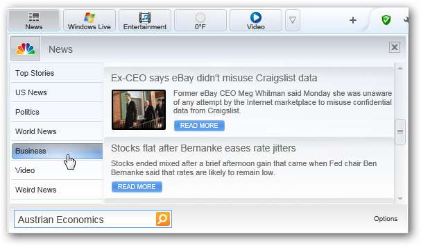 Efter installationen kan du enkelt börja söka med deras standardknappar. I det här exemplet tittar vi på affärsnyheter och de populära rubrikerna visar med en kort beskrivning och bild. Du kan också söka i Bing från sökrutan längst ner i fönstret.