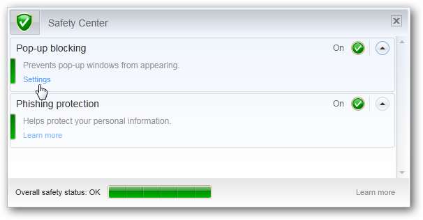 Säkerhetscentret förhindrar popup-fönster och inkluderar skydd mot nätfiske.