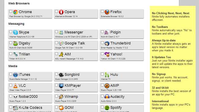 Istället för att tvinga dig att besöka otaliga webbplatser och ladda ner många installatörer för all programvara du behöver, kan Ninite välja alla appar du är intresserade av och få skräddarsydda installationsprogram för dig.