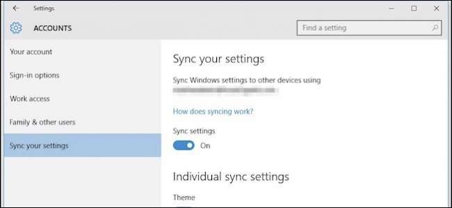 De första inställningarna är alla ganska självförklarande. Inställningen "Tema" synkroniserar dina färg- och bakgrundsval, vilket innebär att om du vill att var och en av dina Windows 10-installationer ska ha sina egna, måste detta vara avstängt.