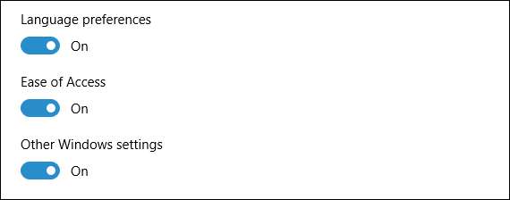 Under huvudsynkroniseringsomkopplaren finns de enskilda synkroniseringsinställningarna. Det här är de inställningar som överförs från en dator till en annan som du loggar in med ditt Microsoft-konto.