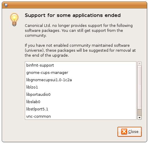 Du kommer troligen att bli ombedd att supporten för vissa applikationer har upphört. Detta är inte nödvändigtvis viktigt, eftersom de flesta av er förmodligen besökt Ubuntu Forums för allt stöd du behöver.