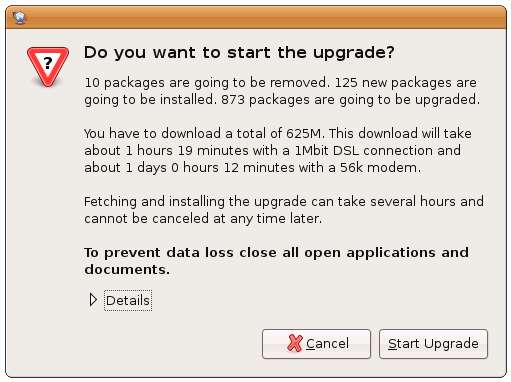 Nu kommer du att bli ombedd ännu en gång om du vill starta uppgraderingen och du kommer att ta reda på att det kommer att ta lång tid att både ladda ner och installera alla uppdateringar.