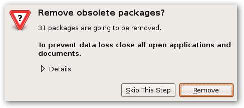 Nu uppmanas du att ta bort föråldrade paket och få en lista med paket att ta bort. Vanligtvis är det bra att ta bort objekten, men du kanske vill kolla listan för alla fall eller hoppa över steget om du inte är säker. Du kan alltid städa upp dem med apt senare.