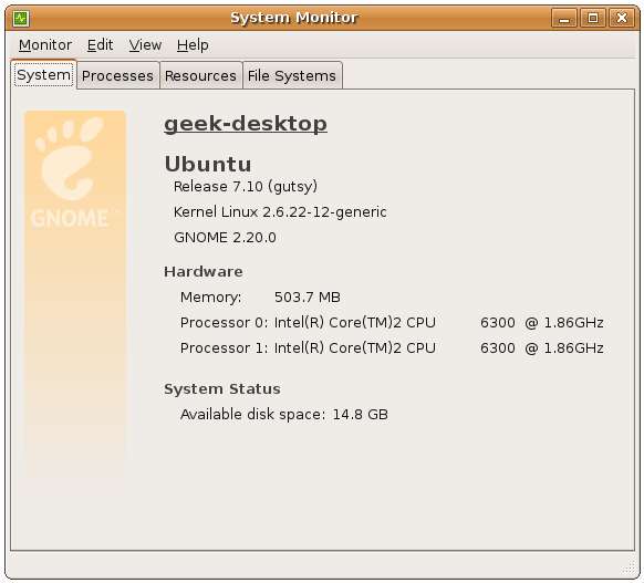 När du har startat om kan du öppna System Monitor i avsnittet administrationsverktyg, och du bör se "Släpp 7.10 (gutsy)" i den här dialogrutan, vilket indikerar att uppgraderingen lyckades.