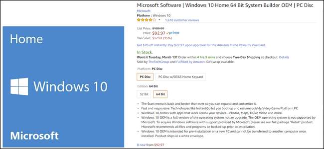 OEM-licenser dyker ofta upp på sekundära marknader. Microsoft brukade faktiskt sälja dem direkt till konsumenter, men inte för Windows 10 - det enda stället att köpa dessa rabatterade kopior är på sekundära detaljhandelsmarknader som eBay, Amazon och Newegg. Du kan köpa och aktivera programvaran normalt, och du kan spara några dollar medan du gör det, men kom ihåg begränsningarna: