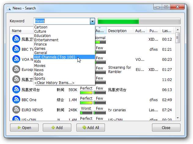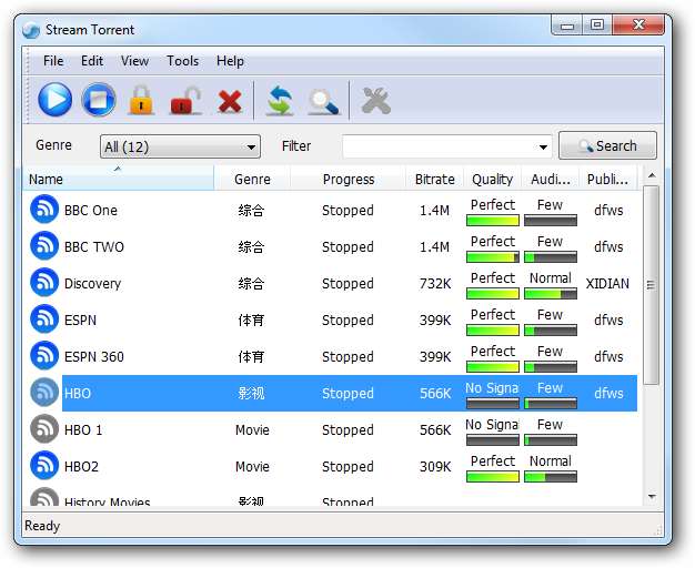 När du har sökt efter flöden lägger du till dem i en spellista där StreamTorrent visar kvaliteten på flödet, namnet och hur många användare som för närvarande tittar på.