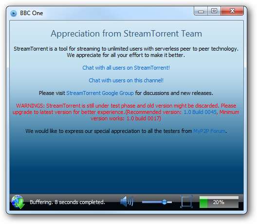 När du först startar en station finns ett meddelande från StreamTorrent-teamet medan det buffras.