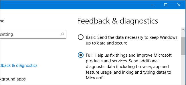 Om du väljer Windows Insider Preview Program , som är utformat för att testa pre-release-versioner av Windows 10 och lösa problem, ställs du automatiskt in på "Full" -nivån. Din enhet skickar ännu mer telemetriinformation till Microsoft om du använder en Insider-version av Windows 10, vilket ger Microsofts utvecklare information om hur nya versioner av Windows 10 fungerar, hur nya funktioner fungerar och om det finns några kompatibilitetsproblem. Det är ju poängen med Insider Preview-programmet.