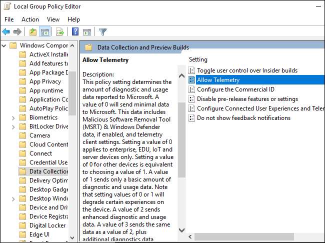 Säkerhetsnivån måste aktiveras via gruppolicy på relevanta utgåvor av Windows, inte appen Inställningar. Den är tillgänglig under Datorkonfiguration> Administrativa mallar> Windows-komponenter> Datainsamling och förhandsgranskning av byggnader> Tillåt telemetri i grupppolicyn.